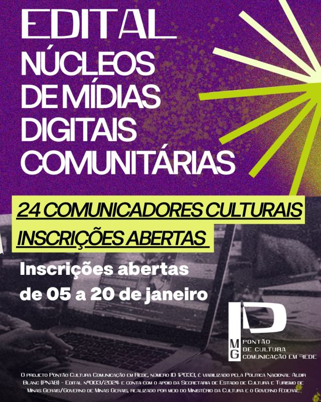 O projeto Pontão Cultura Comunicação em Rede, número ID 17033, é viabilizado pela Politica Nacional Aldir Blanc (PNAB) - Edital n°003/2024 e conta com o apoio da Secretaria de Estado de Cultura e Turismo de Minas Gerais/Governo de Minas Gerais, e realizado por meio do Ministério da Cultura e o Governo Federal.