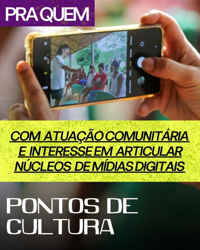 Os Pontos de Cultura selecionados receberão kit multimídia em regime de empréstimo (notebook, celular, microfone, tripé e pacote de dados), além de formação técnica, política e pedagógica, acompanhamento contínuo e suporte metodológico ao longo de todo o processo.